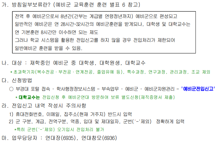 | 첨부파일 | [별표 6] 예비군동원 및 훈련 방침보류 직종(제23조 관련)(예비군 교육훈련 훈령).hwp 전입신고 홍보물(국립부경대 예비군연대).pdf | ||