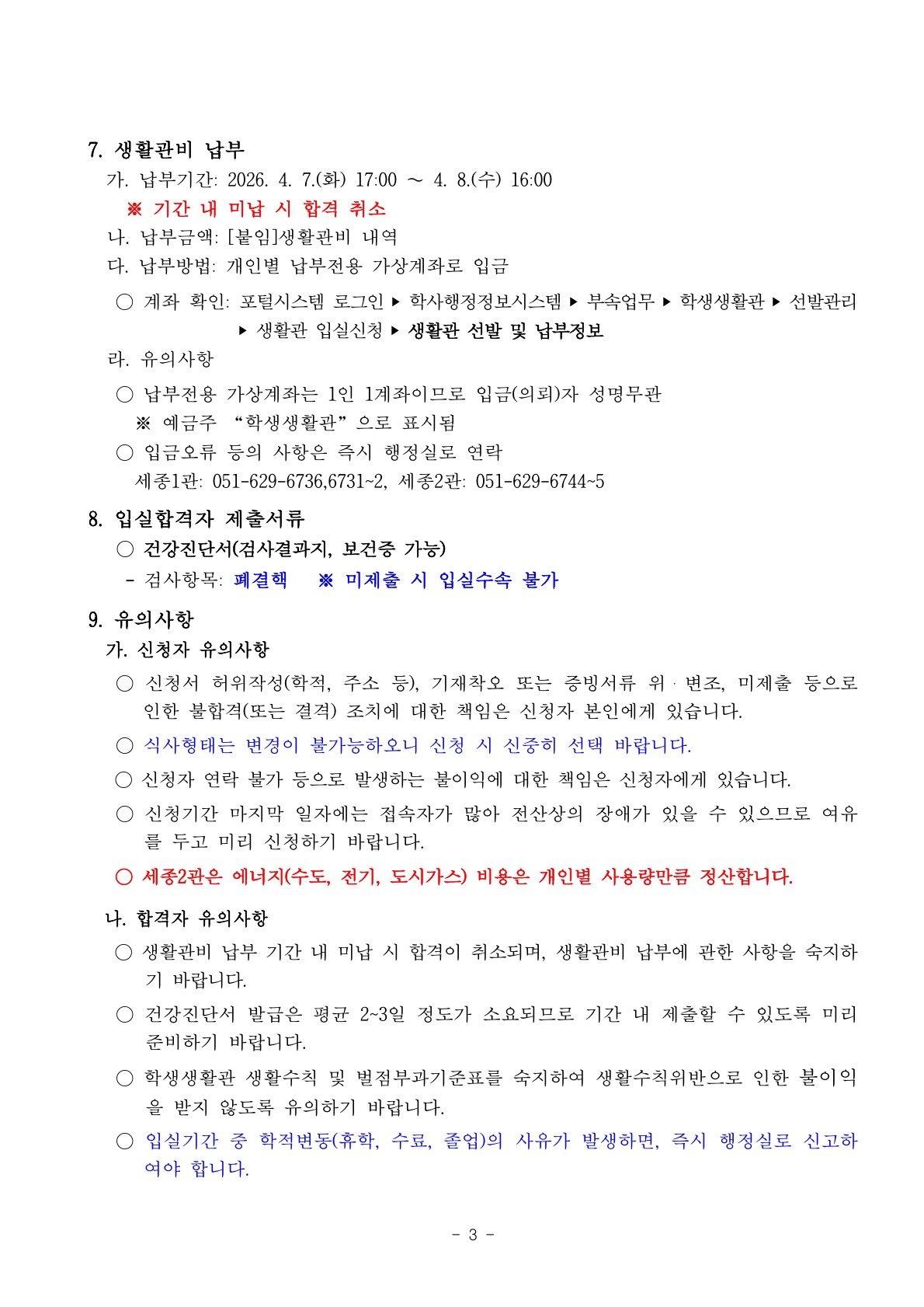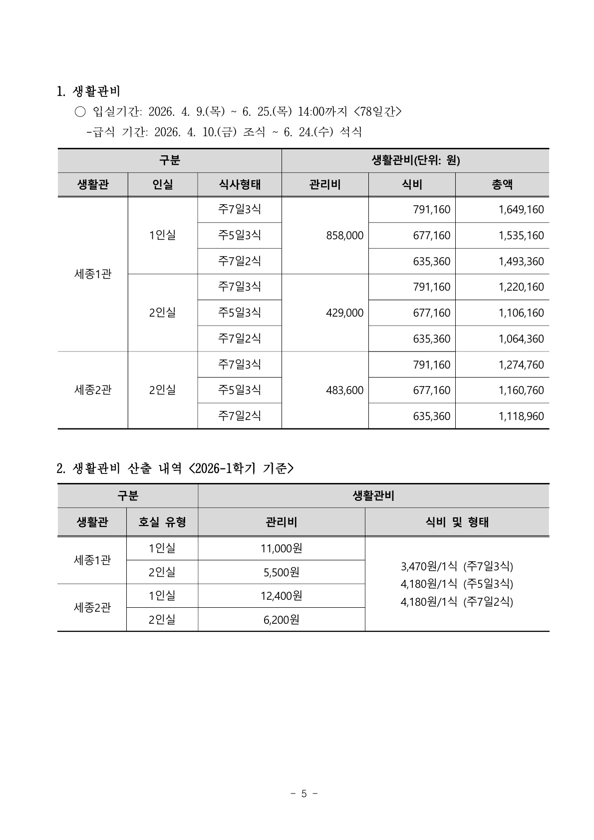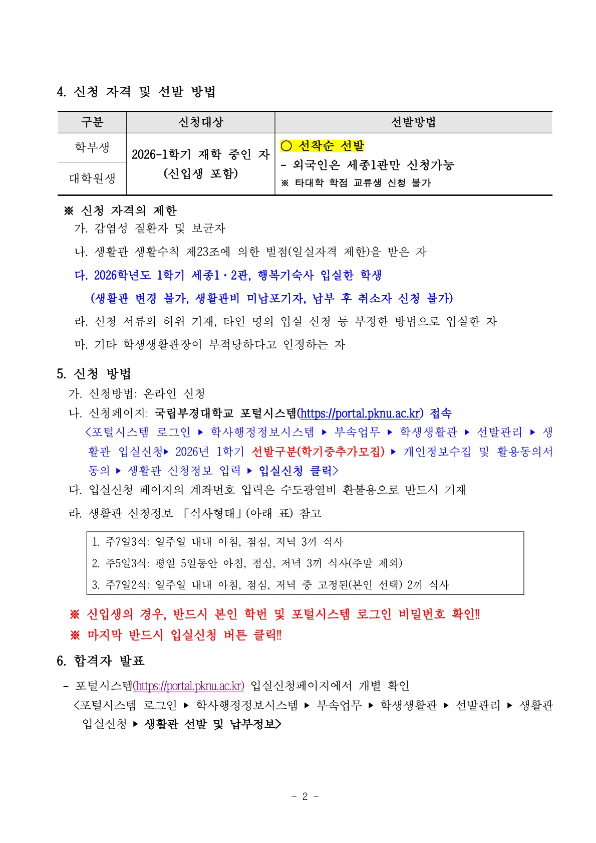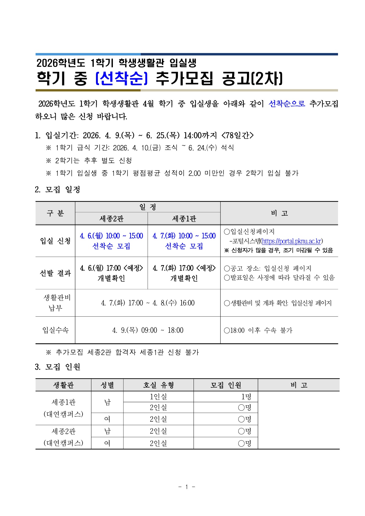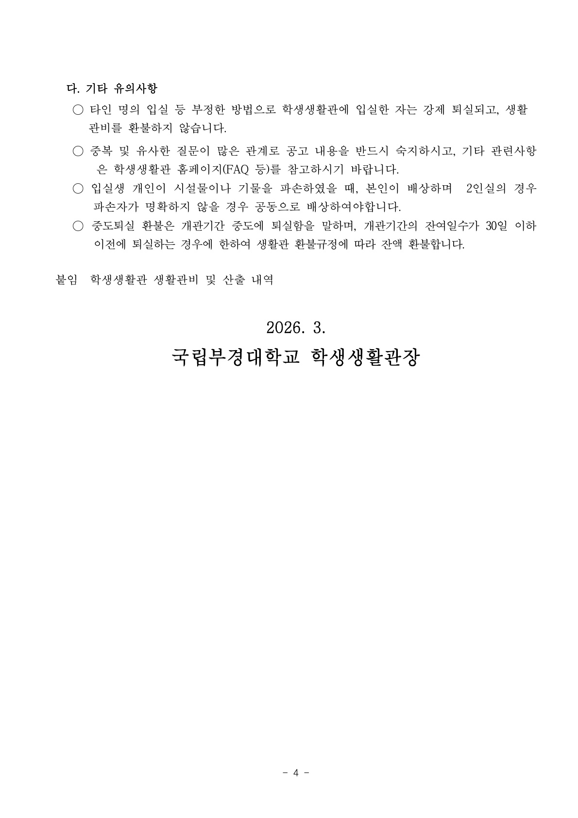 2026학년도 1학기 학생생활관 학기중 추가모집(2차) 안내