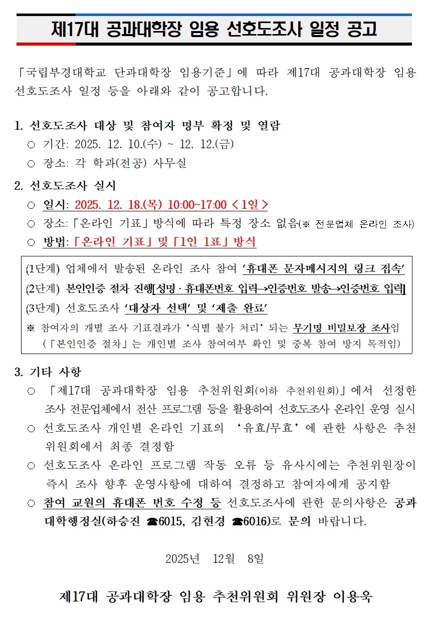 제17대 공과대학장 임용 선호도 조사 일정 공고문