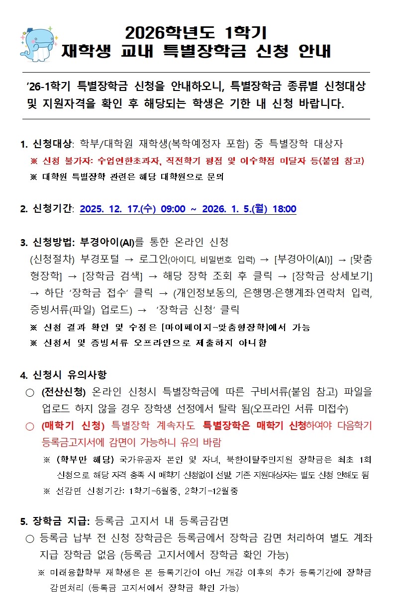 2026학년도 1학기 재학생 교내 특별장학금 신청 안내