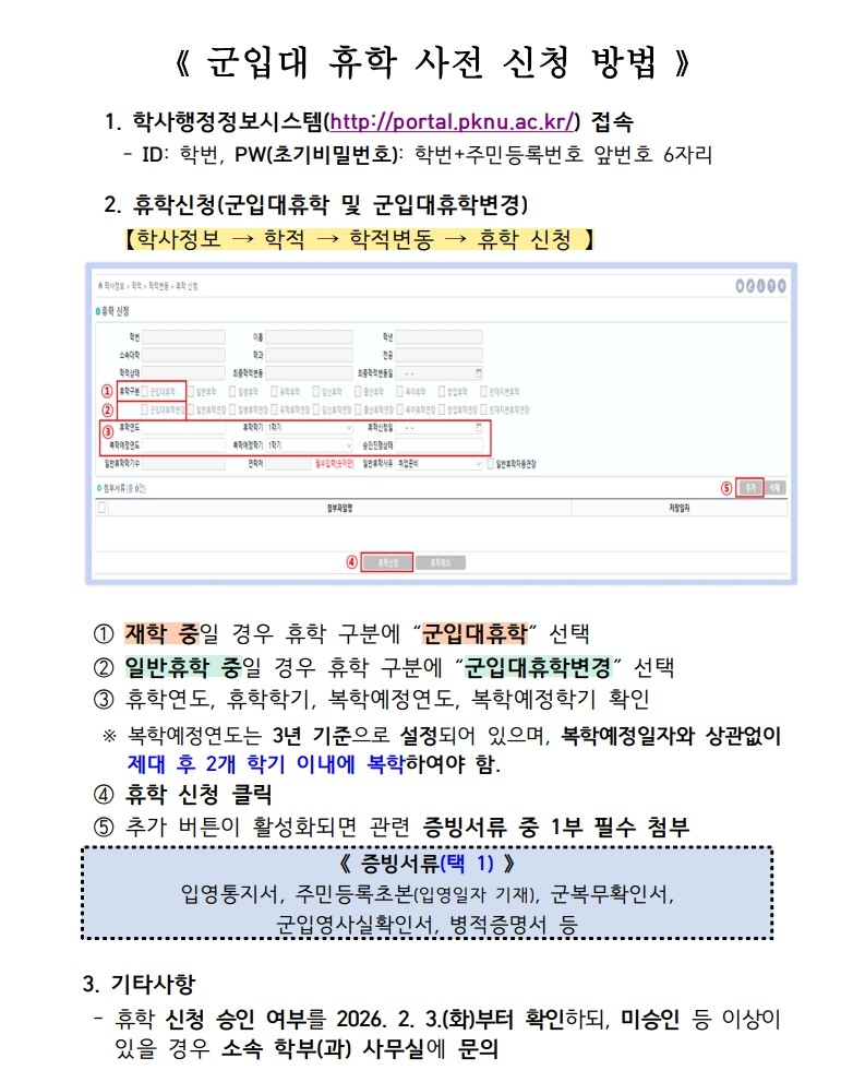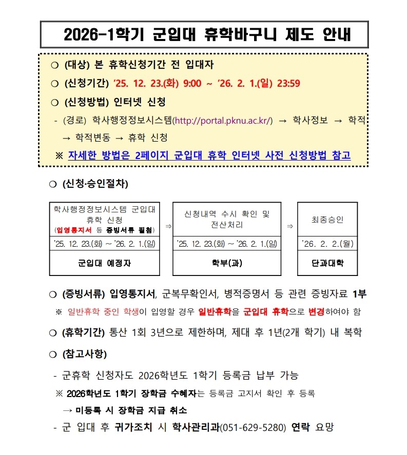 | 2026학년도 1학기 군입대 휴학바구니(사전휴학) 신청 안내 | |||