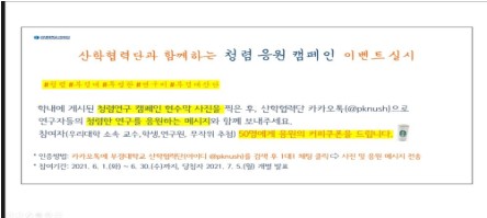 동 캠페인이 교내에 확산될 수 있도록 ‘SNS 청렴 응원 캠페인’ 을 아래와 같이 실시하오니, 참여하여 주시기 바랍니다. ○ SNS 청렴 응원 캠페인 가. 대상: 우리대학 소속 연구자(연구책임자, 연구원, 학생) 나. 추진기간: 2021. 6. 1. ~ 6. 30. 다. 주요내용 - (참여방법) 학내 게시된 청렴동행 캠페인 슬로건 현수막 사진을 찍어 산학협력단 카카오톡 채널(@pknush)로 응원의 메시지와 함께 사진 전송 - (참여혜택) 무작위 추첨 50명 선정, 5,000원 상당 커피 쿠폰 증정 - (당첨자 발표일자) 2021. 7. 5.(월), 개별 연락 예정