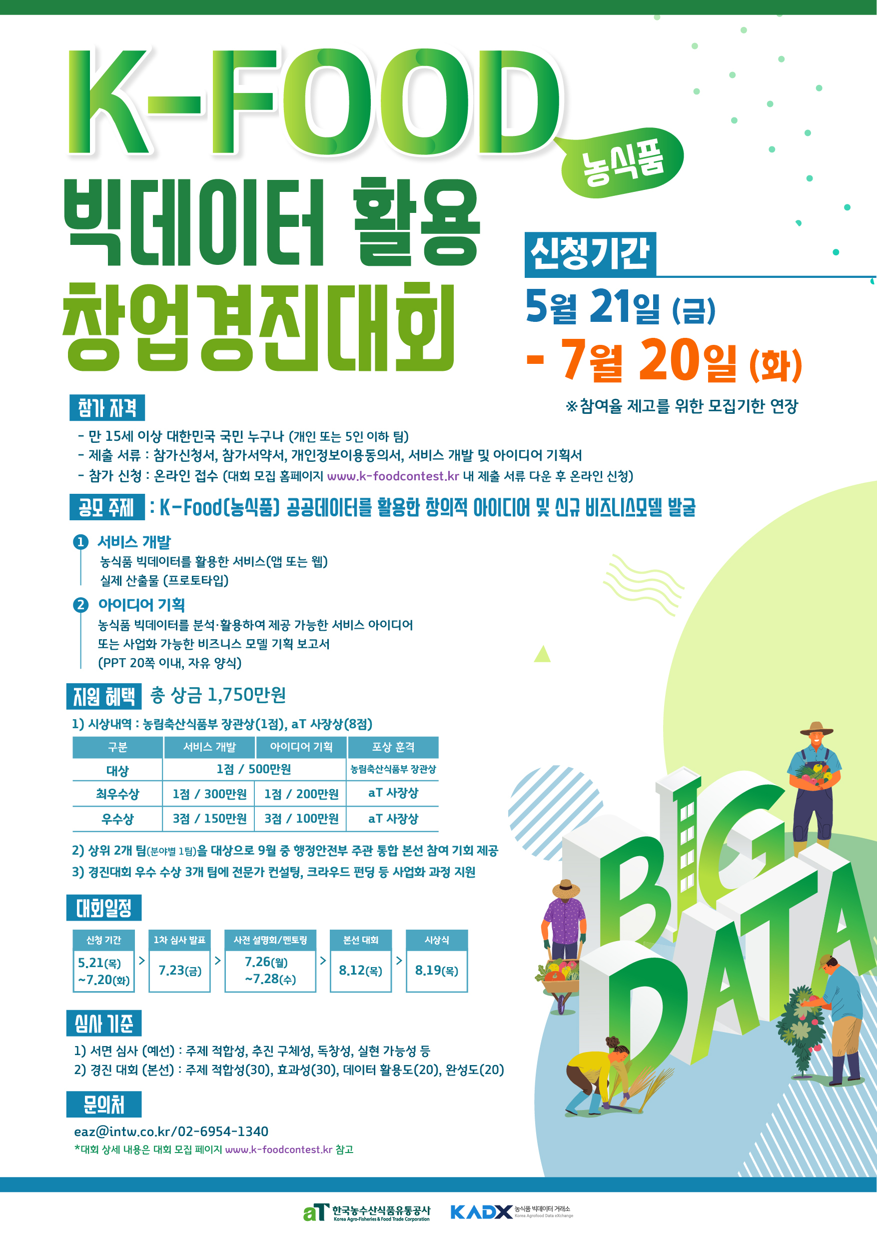 'K-Food 빅데이터 활용 창업 경진대회'를 안내드리오니 참여하시기 바랍니다.