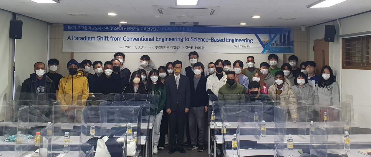 《 BK21 초고층 해양도시 건축 및 소방재난안전기술 교육연구단 해외석학 초청 국제세미나 콜로라도 대학 Yail Jimmy Kim교수 초청 강연》 해외 고급 연구인력과의 직접적인 연구 교류의 기회를 통해 대학원생들의 연구역량 향상, 해외 네트워크 확장 유도. ▷일 자 : 2023.01.03 오후 4시 ▷장 소 : 부경대학교 대연캠퍼스 건축관 8401강의실 및 소속 연구실 ▷강연주제 : A Paradigm Shift from Conventional Engineering to Science-Based Engineering