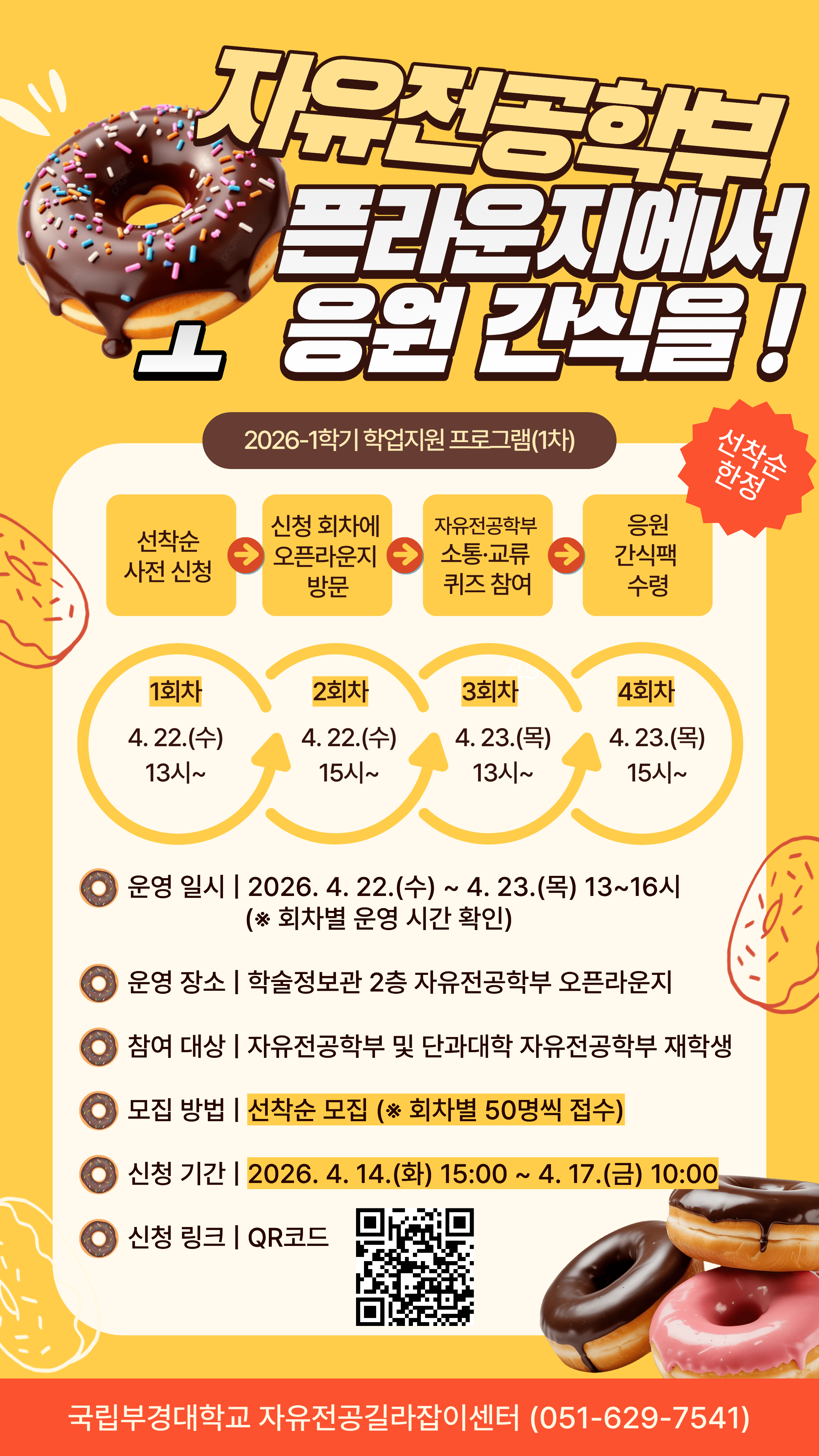 자유전공길라잡이센터에서 2026-1학기 중간고사를 대비하여 응원전 프로그램을 개최하오니 많은 참여를 바랍니다. ※ 자유전공학부 소통·교류 퀴즈 참여하고 시험기간 응원 간식 받아가세요! (오늘 15시부터 선착순 링크 OPEN !) - 프로그램명: 2026-1학기 학업지원 프로그램(1차) - 운영일시: 2026. 4. 22.(수) ~ 4. 23.(목) 13~16시 (※ 회차별 운영 시간 확인) - 운영장소: 학술정보관 2층 자유전공학부 오픈라운지 - 참여대상: 자유전공학부 및 단과대학 자유전공학부 재학생 - 모집방법: 선착순 모집 (※ 회차별 50명씩 접수) - 신청기간: 2026. 4. 14.(화) 15:00 ~ 4. 17.(금) 10:00 - 신청링크: https://forms.gle/Kof3T2PnFievVpdj7 (링크 클릭 가능) - 문의사항: 자유전공길라잡이센터(051-629-7541)