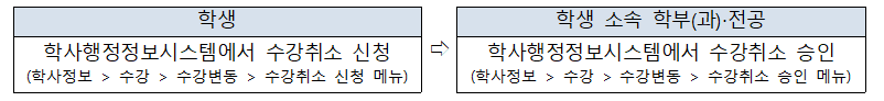 2026-1학기 학부 교과목 수강취소 기간을 안내합니다. 수강 취소가 필요한 경우, 기한 내 신청바랍니다. 가. 취소대상: 수강신청 변경기간 이후 부득이한 사유로 수강취소 할 과목[3과목 이내] 나. 취소신청 및 승인기간 1) 학생 신청기간: 2026. 3. 16.(월) ~ 3. 20.(금) 09:00~18:00 2) 학과 승인기간: 2026. 3. 16.(월) ~ 3. 23.(월) 09:00~18:00 다. 처리절차