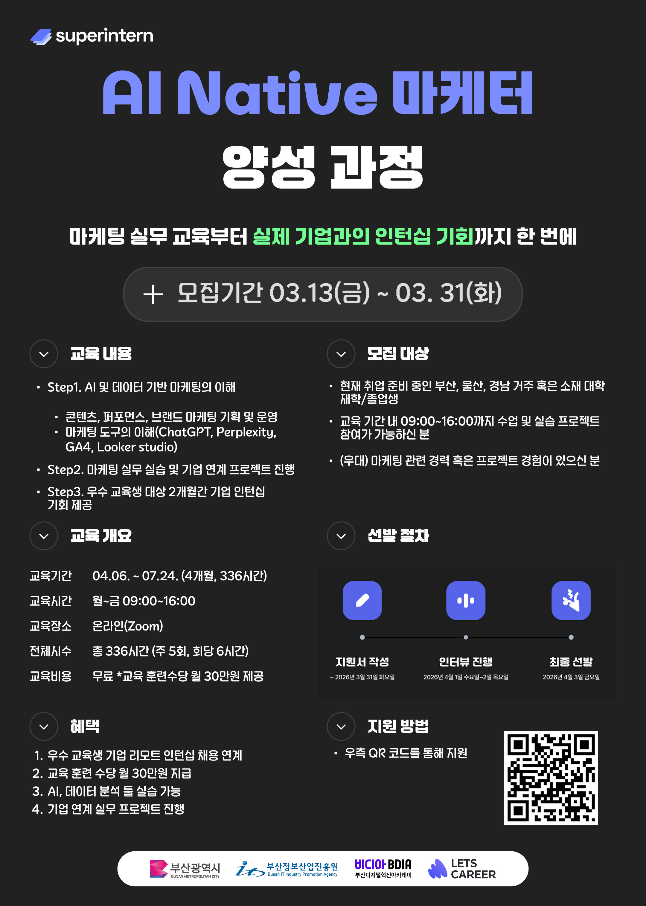 2026년 AI Native 마케터 양성 과정 교육생 모집에 대해 안내드립니다. * 과정 개요 - 부산/울산/경남 거주자 또는 부산/울산/경남 소재 4년제 대학 졸업·예정자 - 미취업자 대상 (전공 무관) * 교육생 지원 사항 - 교육비 전액 무료 - 훈련 수당 월 30만원 지급 - 우수 교육생 과정 중 프로젝트 기간 동안 기업 연계 인턴십 진행 - 현직 헤드헌터 1:1 취업 코칭 및 포트폴리오 구축 지원 * 이런 분께 추천합니다 - 마케팅 직군으로 커리어를 시작하고 싶은 분 - AI가 대체되지 않고 AI를 활용하는 마케터가 되고 싶은 분