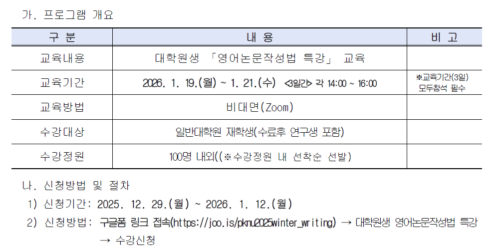 | 첨부파일 | [4단계 BK21 대학원혁신사업]_2025-2학기 PKNU Global역량강화 프로그램_(영어논문작성법 특강) 운영 계획.hwp | ||