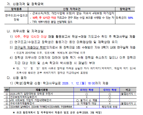 * 장학금 지급 방법: 2026-1학기 등록금 고지서에 사전 감면 (예정) 혹은 후지급 * 후지급: 이번 신청 기간에 장학금을 신청하지 못한 경우 2026년 3월 초 추가 신청 기간에 장학금 신청이 가능 (단, 후지급 사유에 해당되며 2026년 6월 말 지급 예정) * 다음 학기 타 학과로 전과 예정인 경우에도 미디어커뮤니케이션학과로 제출 (전과 확정 후 일괄 변경 예정) * 4대 사회보험 가입자 가입내역확인서 및 건강보험자격득실확인서의 경우 2026년 1월 발급한 건에 한함 * 2026년 2월 수료 예정자는 신청 불가 * 문의: 국립부경대학교 일반대학원 (051-629-5193) |