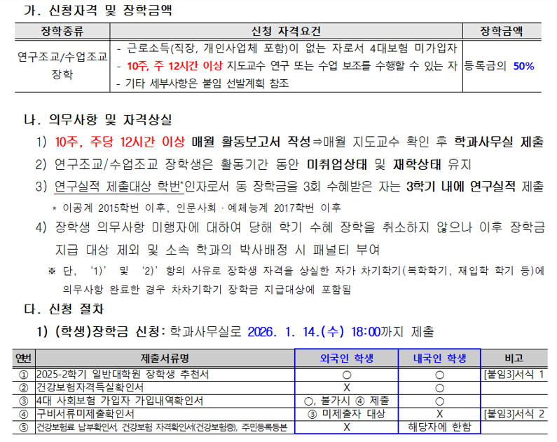 * 장학금 지급 방법: 2026-1학기 등록금 고지서에 사전 감면 (예정) 혹은 후지급 * 후지급: 이번 신청 기간에 장학금을 신청하지 못한 경우 2026년 3월 초 추가 신청 기간에 장학금 신청이 가능 (단, 후지급 사유에 해당되며 2026년 6월 말 지급 예정) * ②, ③, ⑤ 제출 서류의 경우 2026년 1월 발급한 건에 한함 * 문의: 국립부경대학교 일반대학원 (051-629-5193) |
