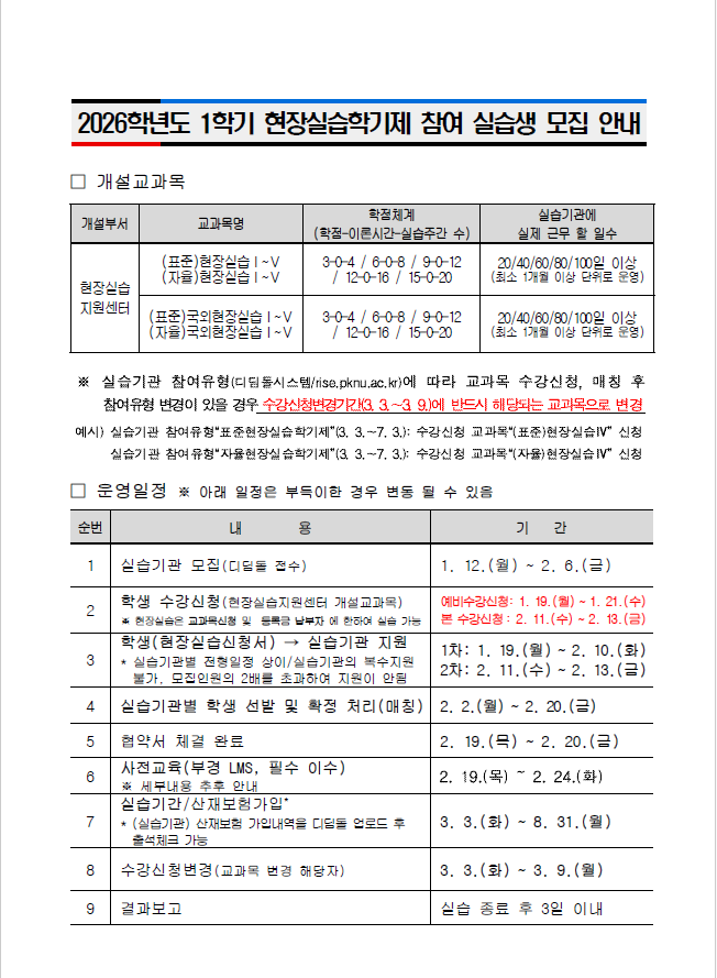 | 2026학년도 1학기 현장실습학기제 참여 실습생 모집 안내 | |||
