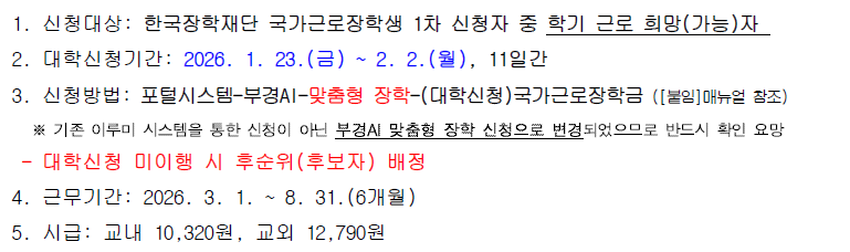 2026학년도 1학기 국가근로장학금 대학 신청 기간 및 변경된 신청 방법을 안내드립니다.