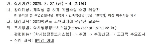 2026학년도 하계 계절 수업 개설 희망 강좌 수요 조사에 대해 안내드립니다.