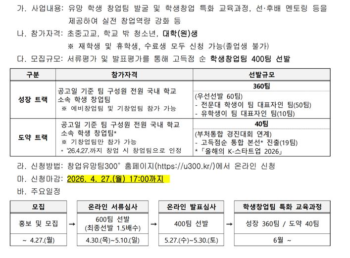 '2026 학생 창업 유망팀 300+' 사업에 대해 안내드립니다.