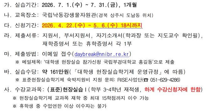 국립낙동강생물자원관 2026년 대학생 현장 실습 학기제 참가 학생 모집에 대해 안내드립니다.