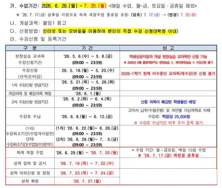 2026학년도 하계 계절 수업 일정에 대해 안내드립니다.