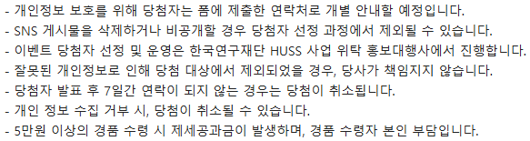 * 참여 방법(블로그) 1. HUSS 인사이트에서 배운것과 느낀점을 포함해 참여 후기를 작성해 주세요! (사진 10장 이상 / 1,000글자 이상) 2. 작성한 참여 후기는 필수 해시태그와 함께 업로드 해주세요! #HUSS #HUSS인사이트 #인문사회 융합인재양성사업 3. 업로드한 게시물 URL은 네이버폼에 제출하면 끝! * 포토 후기 이벤트와 중복 참여 가능!