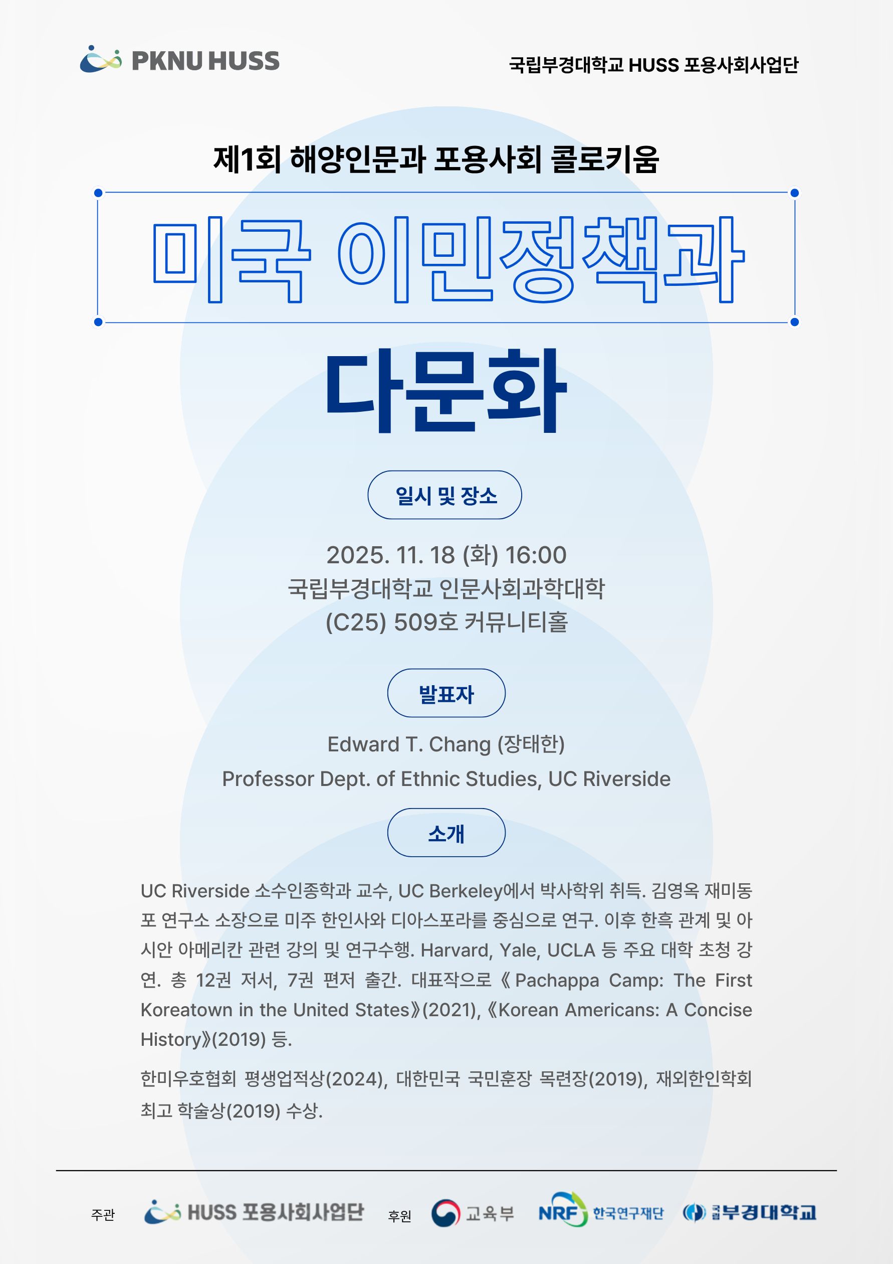 국립부경대학교 HUSS 포용사회 사업단에서 제1회 콜로키움을 개최합니다. 주제: 미국 이민정책과 다문화 일시: 2025. 11. 18(화), 16:00 장소: 국립부경대학교 인문사회과학대학(C25) 509호 커뮤니티홀 발표자: Edward T. Chang(장태한), Professor Dept. of Ethnic Studies, UC Riberside 많은 관심과 참여 부탁드립니다.