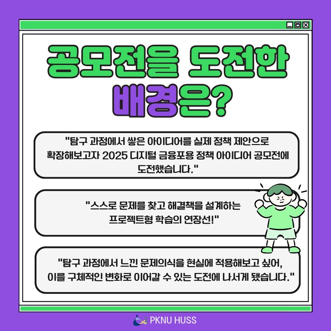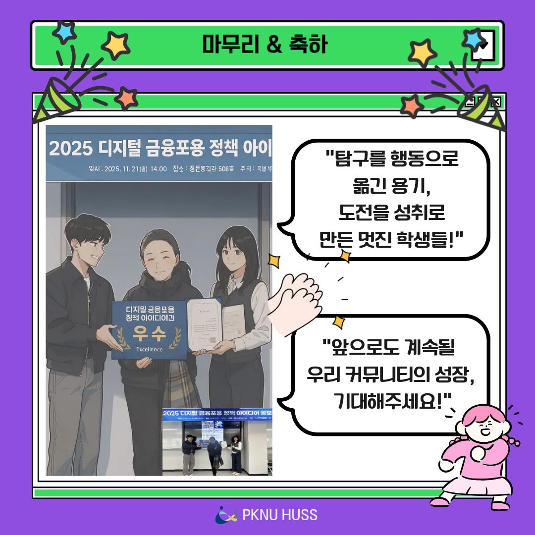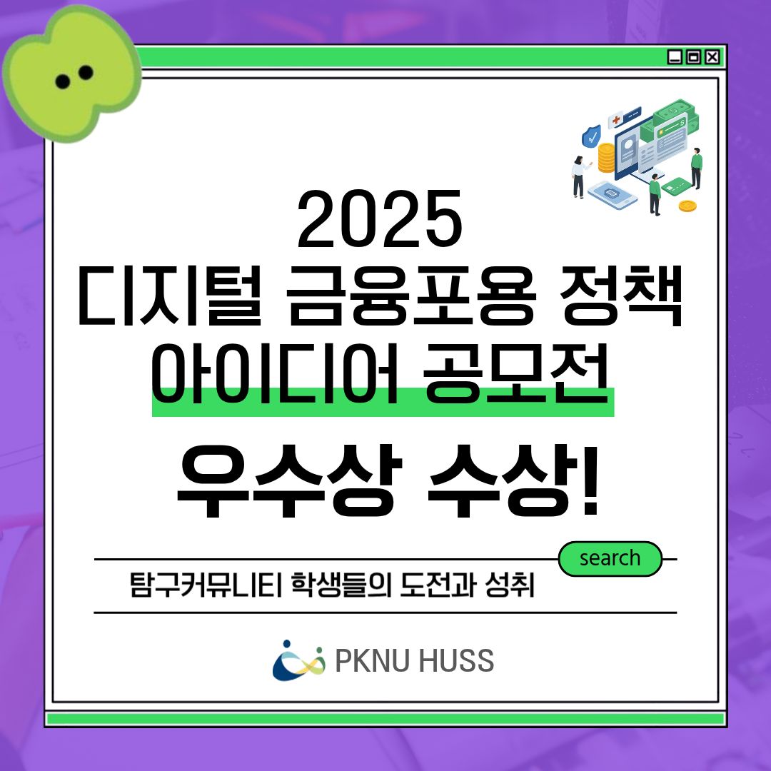 국립부경대학교 탐구커뮤니티 콤마가 2025 디지털 금융포용 정책 아이디어 공모전에서 우수상을 수상했습니다. 자세한 내용은 아래 카드뉴스를 참고해주세요.