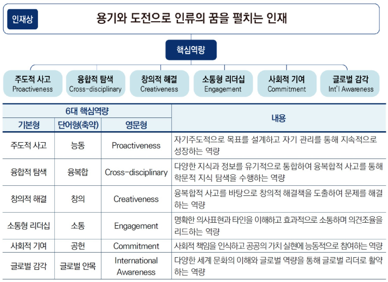 PKNU 핵심역량은 우리 대학의 인재상 “용기와 도전으로 인류의 꿈을 펼치는 인재”의 확립 및 핵심가치의 실현을 위해 국립부경대학교 학생이라면 필수적으로 갖추어야 할 6대 핵심역량을 의미합니다.
