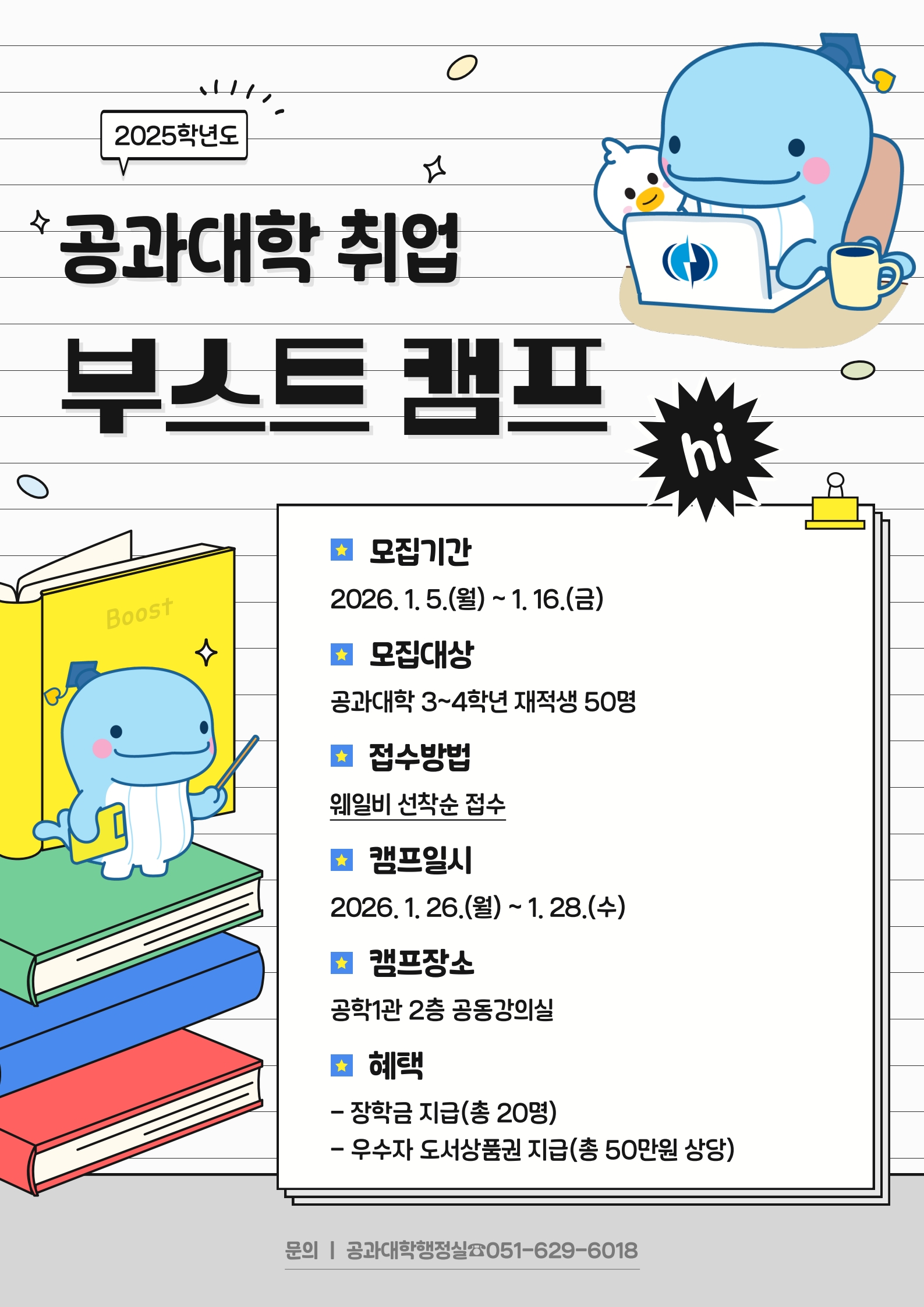 공과대학생의 취업 준비 완성도 향상을 위하여 취업 부스트 캠프를 다음과 같이 운영하고자 하오니, 학생들의 많은 참여 바랍니다. 1. 프로그램 개요 가. 프로그램명: 2025학년도 공과대학 취업 부스트 캠프 나. 일 시: 2026. 1. 26.(월) ~ 1. 28.(수) 다. 장 소: 공학1관 2층 공동강의실 라. 내 용 - 집중 1:1 자기소개서 컨설팅 - 맞춤형 면접 스타일 진단 및 유형별 롤플레잉 - 현직자 중심 실전 모의면접 및 개별 피드백 2. 신청 개요 가. 모집기간: 2026. 1. 5.(월) ~ 1. 16.(금) 나. 모집대상: 공과대학 소속 3~4학년 재적생 50명 다. 모집 및 선발방법 - 국립부경대학교포털 로그인-부경 AI-비교과(웨일비)를 통해 접수 - 선착순에 의거하여 선발 라. 신청결과: 모집 종료 후 ‘웨일비-마이페이지’에서 확인 3. 지원 사항 가. 장학금 지급: 참여학생 중 모의면접 우수자(총 20명)를 선정하여 장학금 지급 (1인당 50,000원/ 생활비 보조) 나. 도서상품권 지급: 프로그램별 우수자 총 500,000원 지급