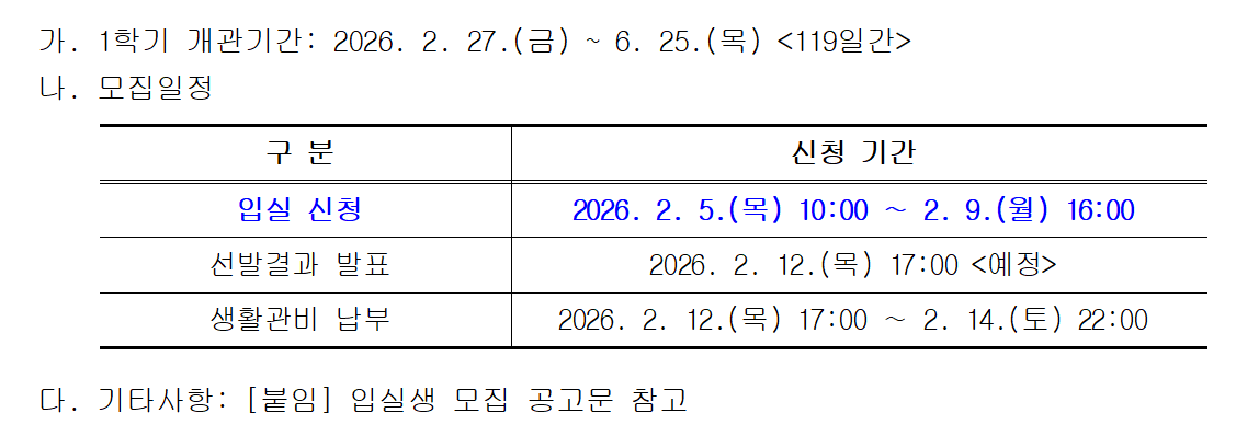 2026학년도 학부(정시) 및 대학원 신입생 합격자 중 학생생활관 입실생(1학기)을 다음과 같이 모집하오니 입실희망자는 기간내 신청 바랍니다.