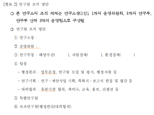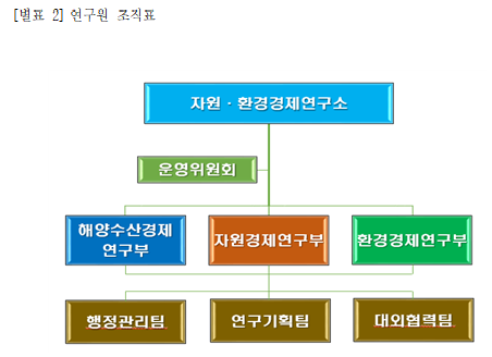 1. 연구소에는 운영위원회와 해양수산경제연구부, 자원경제연구부, 환경경제연구부 등 3개의 연구부를 두며, 행정관리팀, 연구기획팀, 대외협력팀을 둔다.