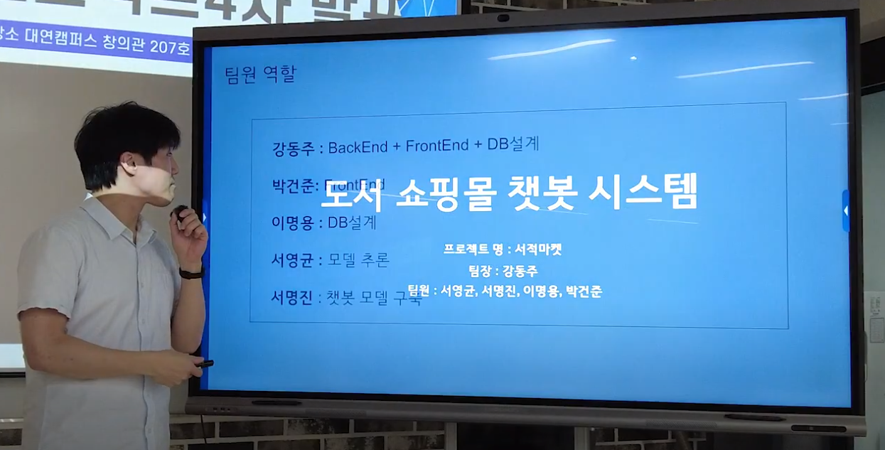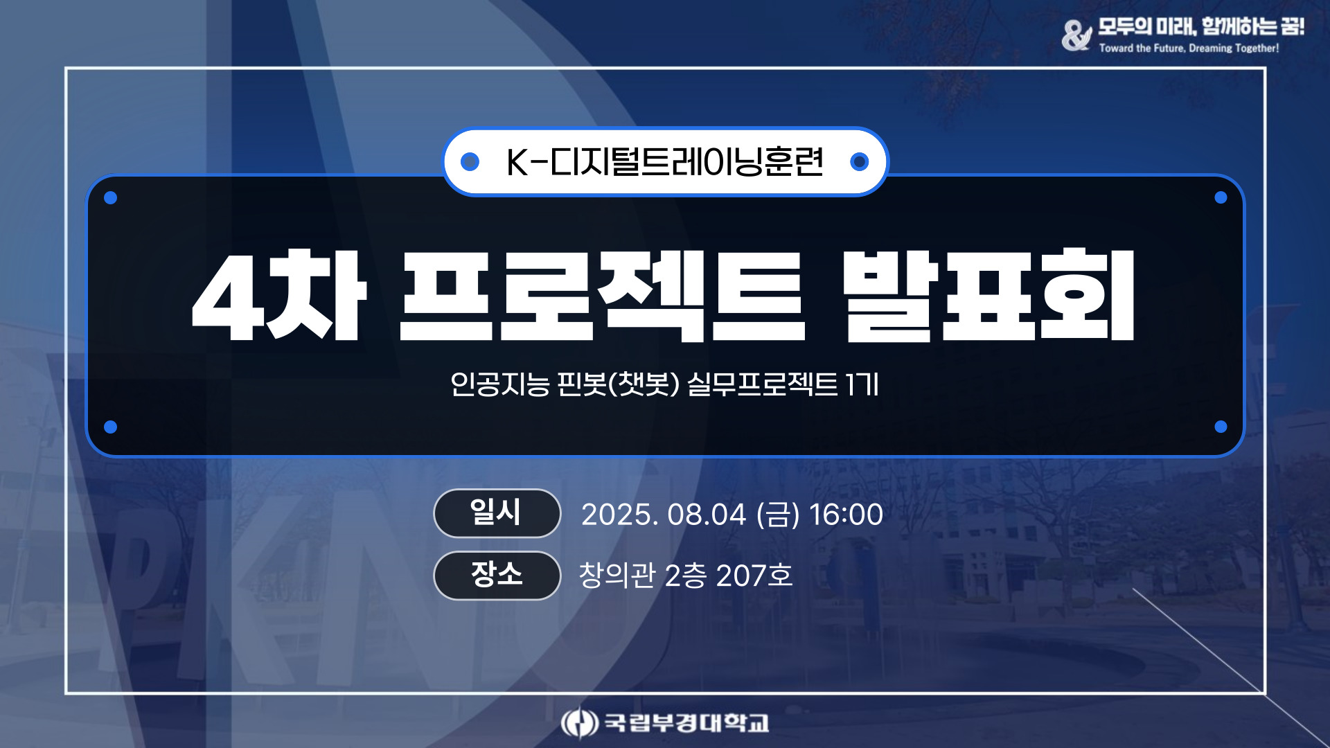 인공지능 핀봇(챗봇) 실무 프로젝트 1기 과정의 대망의 파이널(4차) 프로젝트 발표 현재 진행중인 인공지능 핀봇(챗봇) 1기 과정의 파이널 프로젝트 발표입니다. 이미 취업이 되시거나 채용확정이 되신 분들이 있어서 분위기가 사뭇 다릅니다. 총 2개 팀이며 각 팀별로 발표가 진행됩니다. 아래 발표 이미지를 클릭하면 해당 영상을 보실 수 있어요! (공식 유튜브 채널의 컨텐츠로 연결)