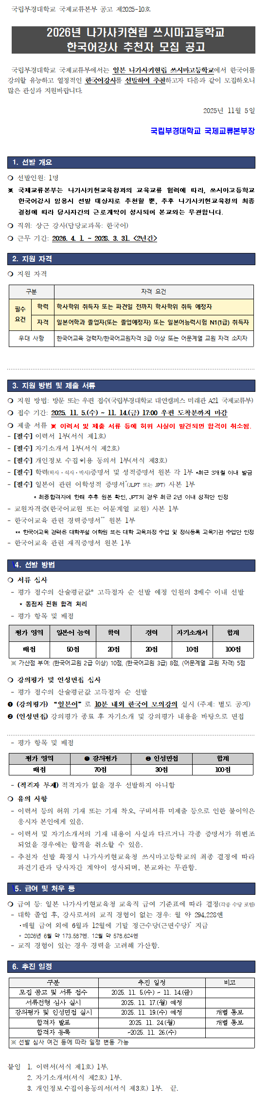 2026 일본 나가사키현립 쓰시마고등학교 한국어강사 추천자 선발 모집 안내