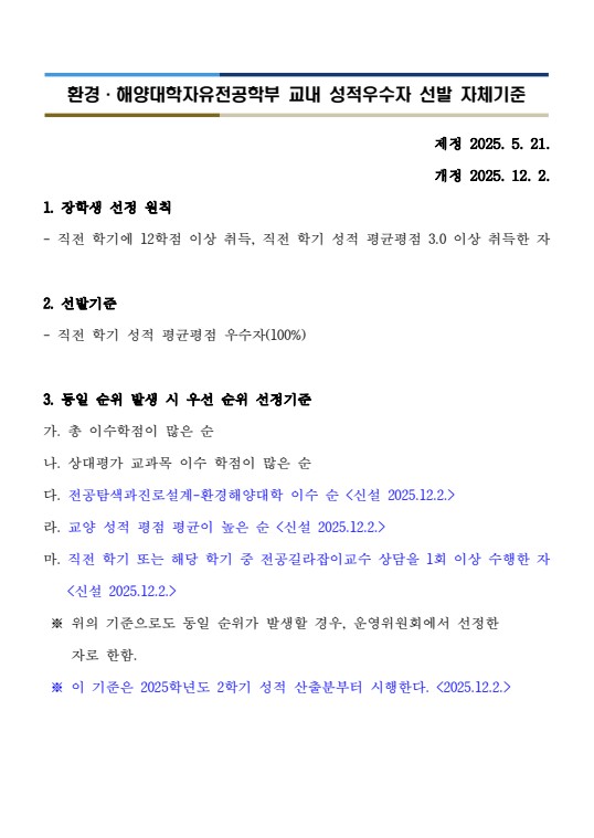 환경해양대학자유전공학부 성적우수 장학생 선발 기준 안내(개정)