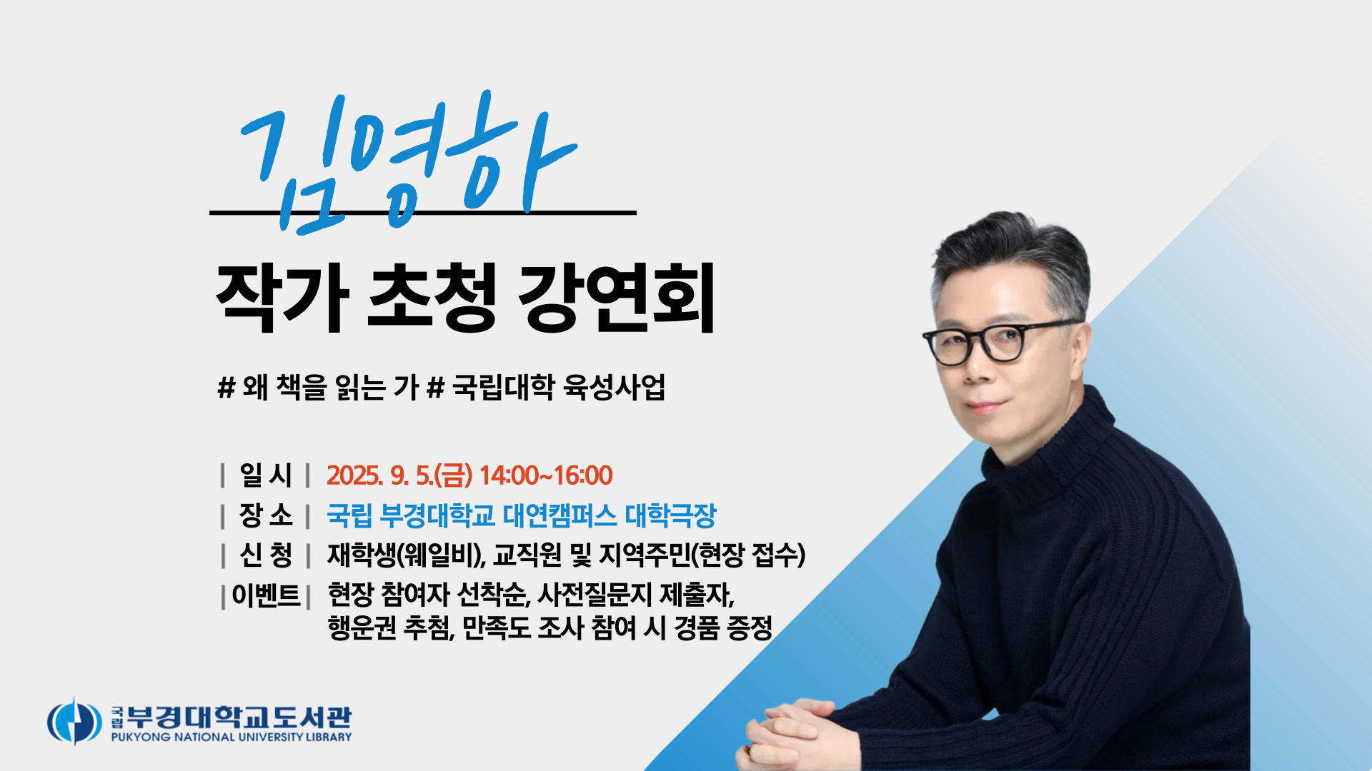 □ 프로그램: [국립대학 육성사업] 김영하 작가 초청 강연 ‘왜 책을 읽는가’ - 일 시: 2025. 9. 5.(금) 14:00~16:00 - 장 소: 대학극장 - 참가대상: 국립부경대학교 구성원 및 지역주민 누구나 - 신청방법: 재학생(비교과 통합 플랫폼 웨이비 신청) - 사전질문: https://naver.me/FoI4MhmE - 참여혜택: 행사 이벤트 참여 및 강연 참여자 직원 상시학습인정(2시간) - 상세안내: 도서관 홈페이지 공지사항 (https://libweb.pknu.ac.kr/board/notice/?pid=14272)