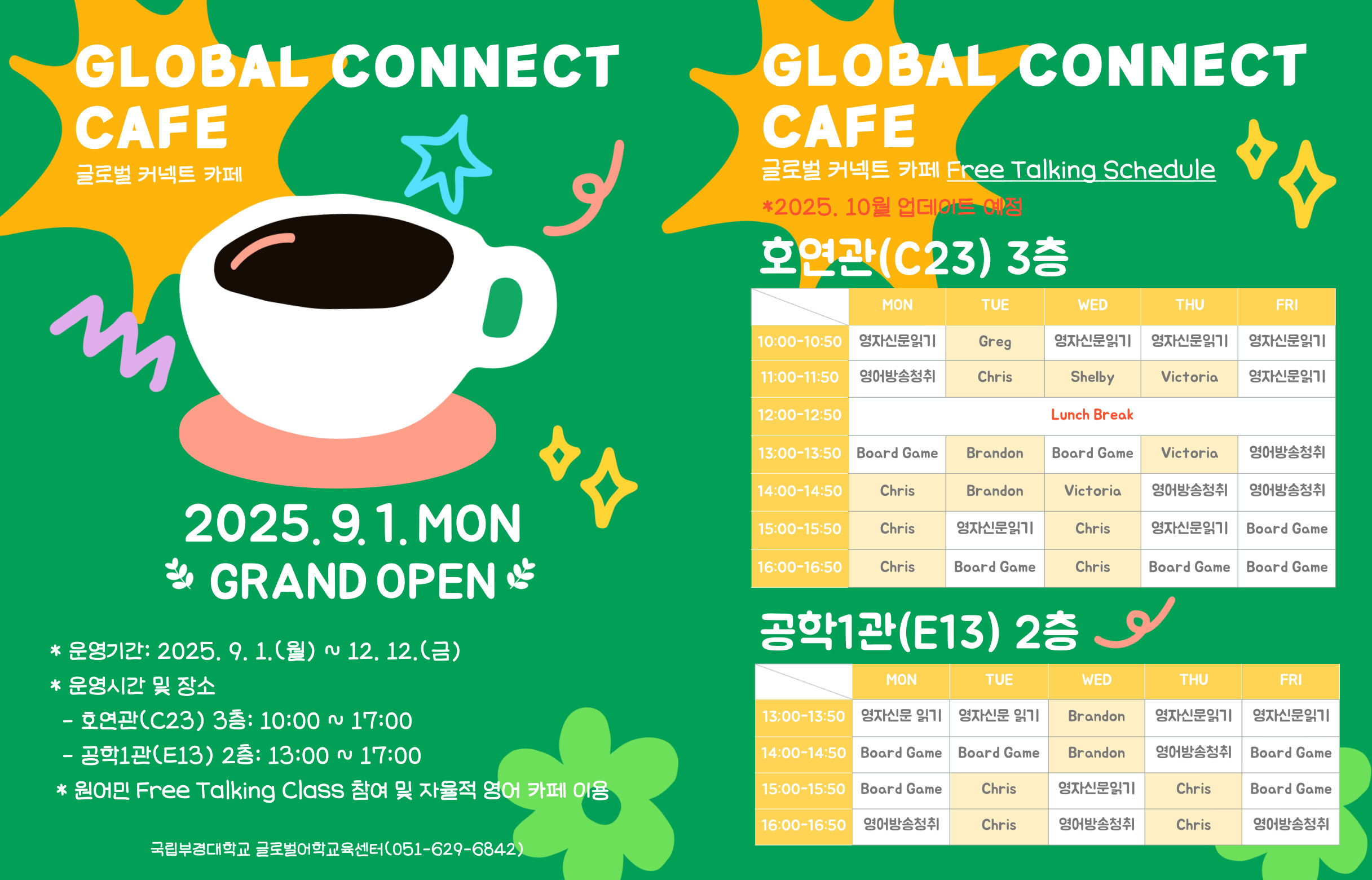 글로벌어학교육센터는 재학생들의 영어회화 실력 향상을 위하여 2025-2학기 글로벌 커넥트 카페(GCC)를 운영하오니 많은 학생들의 참여바랍니다. 가. 운영기간: 2025. 9. 1.(월) ~ 2025. 12. 12.(금), <13주> ※ 주말, 공휴일, 중간고사 기간 미 운영 나. 참여대상: 학부 및 대학원 재적생 다. 운영장소: 호연관(C23) 3층, 공학1관(E13) 2층 라. 운영내용: Free Talking Class(외국인 강의초빙교수 참여 영어회화) 및 자율적 영어 카페 이용 마. 혜 택: 비교과 수료증 발급 및 우수 이용자 소정의 선물 지급 |