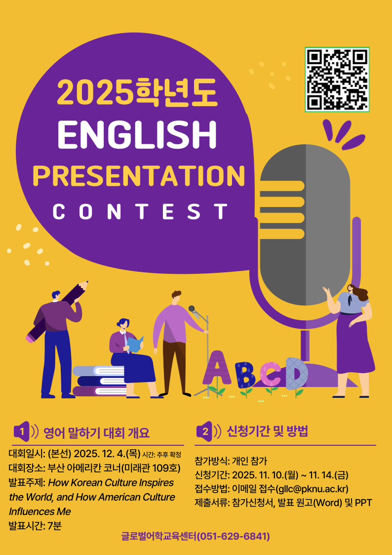 국제교류본부 글로벌어학교육센터 주관 2024 영어말하기대회(English Presentation Contest)에 많은 학생들의 참여 부탁드립니다. 가. 참가대상: 본교 학부 재학생 ※휴학생·본교 수용 교환학생·영어가 모국어인 학생 참가 불가 나. 대회(본선)일시: 2025. 12. 4.(목) ※시간: 추후 확정 다. 참가신청: 2025. 11. 10.(월) ~ 11. 14.(금) 18:00 ( 이메일로 접수: gllc@pknu.ac.kr) 라. 참가유형: 개별 참가 마. 발표주제: How Korean Culture Inspires the World, and How American Culture Influences Me (발표시간: 7분 분량) 바. 제출서류: ①참가신청서, ②발표원고(워드 파일) 및 PPT 사. 시상(문화상품권 지급): 대상(1명), 최우수상(2명), 우수상(2명), 장려상(2명), 참가상(3명) 아. 공지사항 QR: