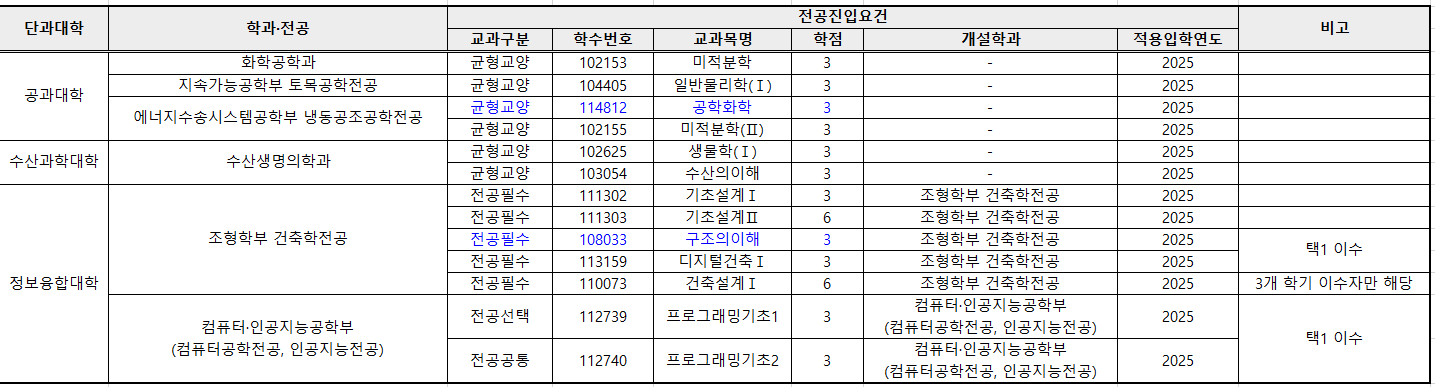 2026학년도 자유전공학부 전공배정 전공진입요건을 아래 및 붙임과 같이 안내합니다. ○ 전공진입요건 지정 학과·전공 현황 ※ 세부내용: 붙임 참고 - 공과대학 화학공학과, 지속가능공학부 토목공학전공, 에너지수송시스템공학부 냉동공조공학전공 - 수산과학대학 수산생명의학과 - 정보융합대학 조형학부 건축학전공, 컴퓨터·인공지능공학부(컴퓨터공학전공, 인공지능전공)