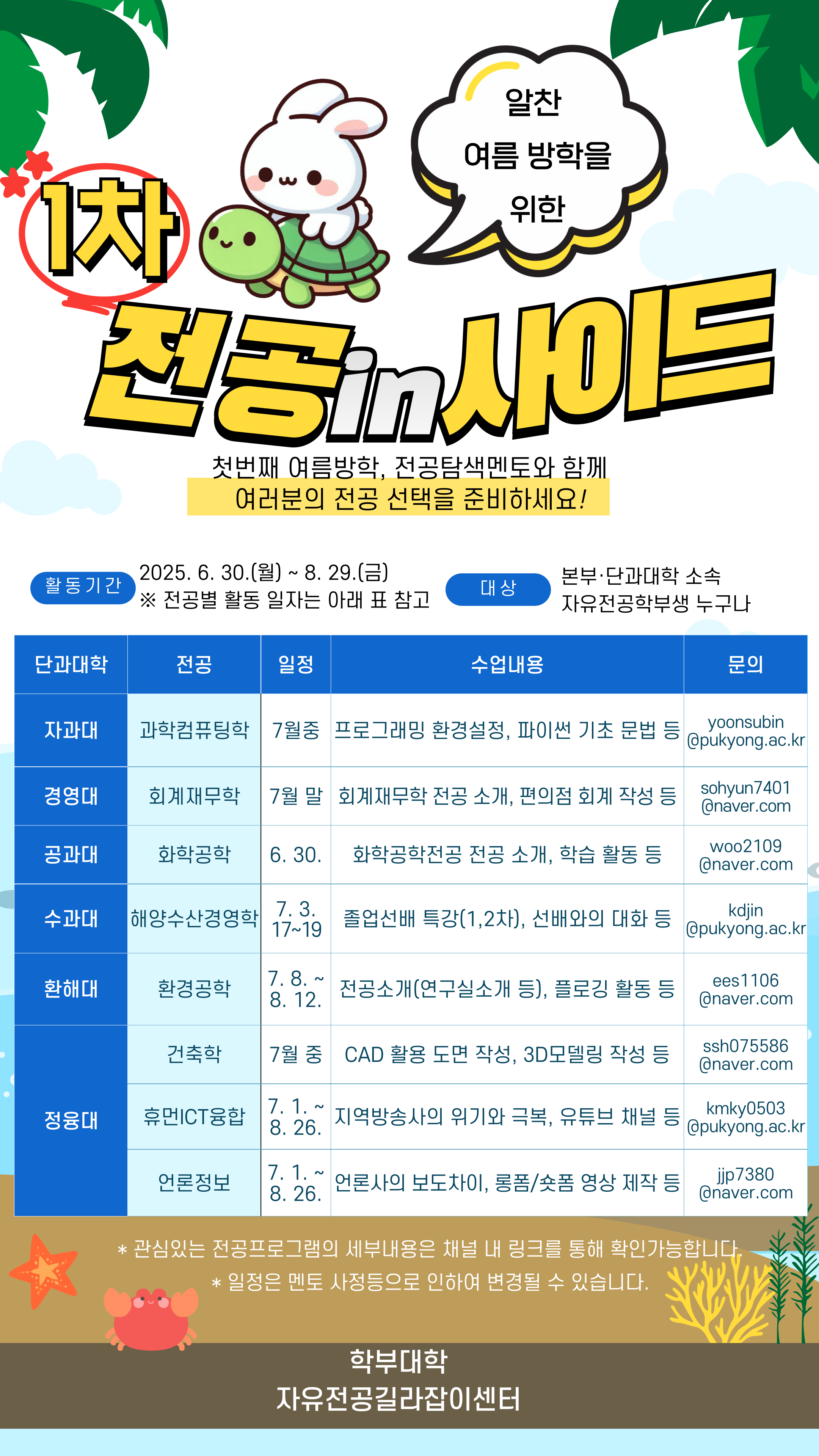안녕하세요, 여름방학 전공in사이드 참여학생을 모집합니다. 프로그램 신청은 문의 이메일로 가능하며, 상세내용은 아래 링크 확인 부탁드립니다. https://college.pknu.ac.kr/college/804