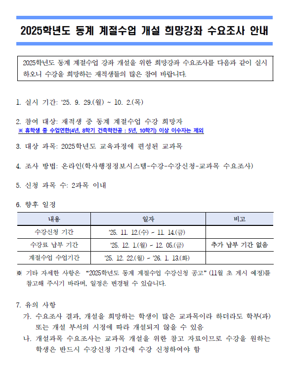 2025학년도 동계 계절수업 개설 희망강좌 수요조사 안내