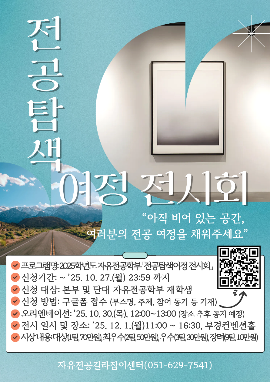 자유전공길라잡이센터에서는 학생들의 전공탐색 성과를 가시화하고 다양한 탐색 경험을 공유·확산하기 위하여 「전공탐색 여정 전시회」를 실시하오니 많은 참여 부탁드립니다. 가. 프로그램명: 2025학년도 자유전공학부「전공탐색여정 전시회」 나. 신청기간: ~ ’25. 10. 27.(월) 23:59 까지 다. 신청 대상: 본부 및 단대 자유전공학부 재학생 라. 신청 방법: 구글폼 접수(부스명, 주제, 참여 동기 등 기재) https://forms.gle/Sh1ibXsuB21cZ5bn7 ※ 개인 또는 팀(1~4명 이내)로 신청 가능하며, 15개를 선정하여 부스 형태로 제작·전시 예정 마. 오리엔테이션: ’25. 10. 30.(목), 12:00~13:00(장소 추후 공지 예정) 바. 전시 일시 및 장소: ’25. 12. 1.(월)11:00 ~ 16:30, 부경컨벤션홀 사. 시상 내용: 대상(1팀, 70만원), 최우수(2팀, 50만원), 우수(3팀, 30만원), 장려(9팀, 10만원)