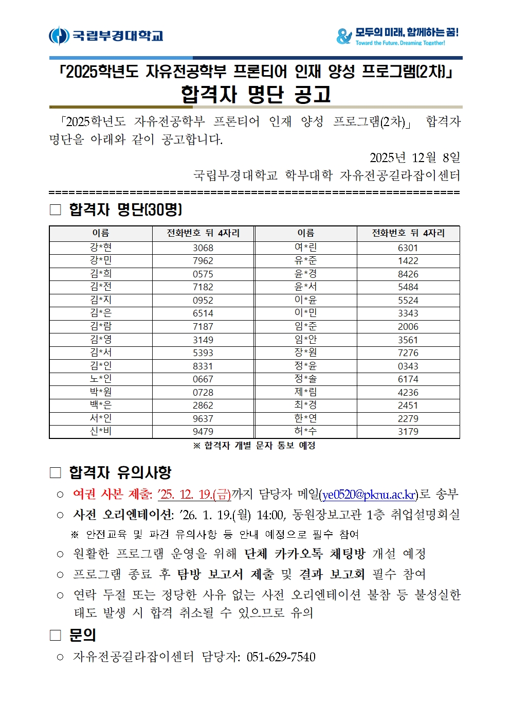 2025학년도 자유전공학부 프론티어 인재 양성 프로그램(2차) 합격자 명단을 아래와 같이 알려드립니다. 합격자에 한해 개별 안내 예정이며, 아래의 유의사항을 반드시 확인하여 주시기 바랍니다. 감사합니다. ![]() |
