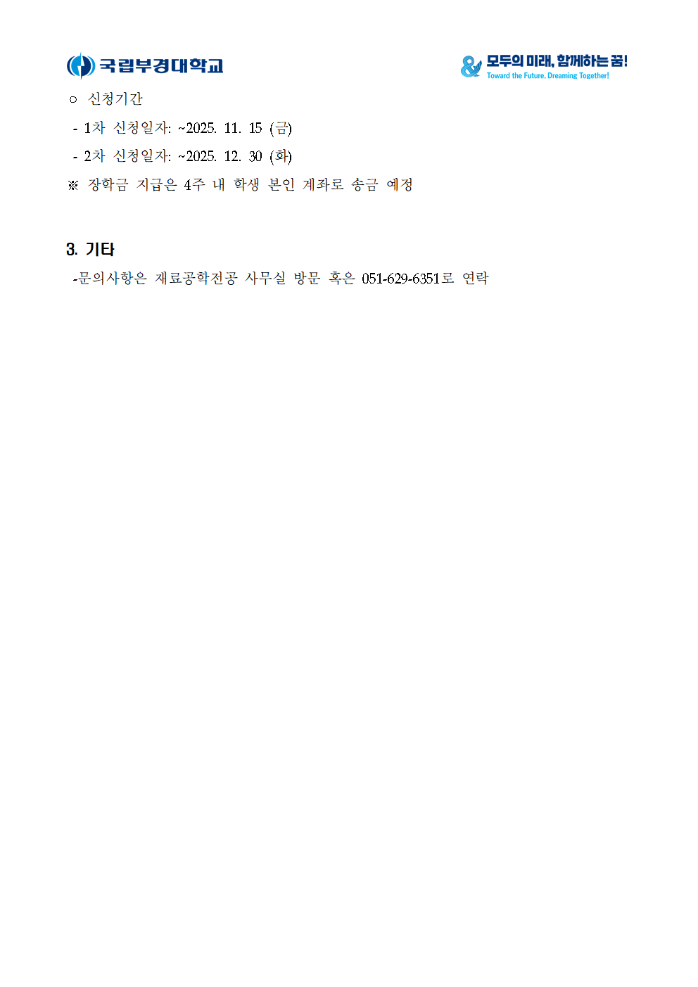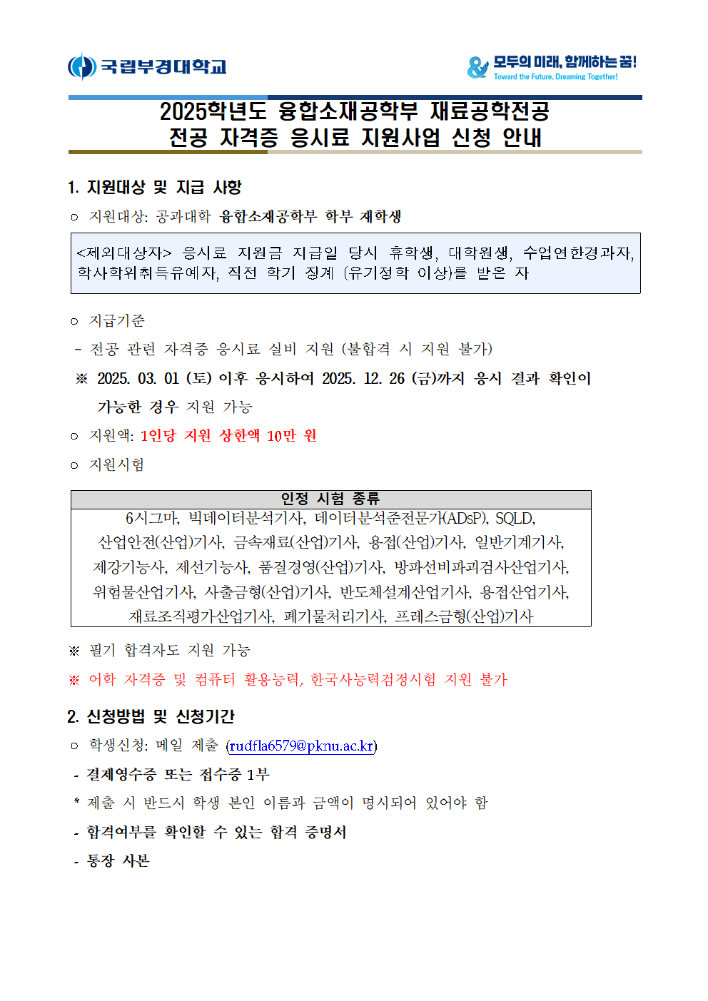 2025.07, 2026.01월에 진행되는 <공과대학 어학/전공 자격증 지원사업> 과 다른 지원사업입니다. ※ 어학 자격증 및 컴퓨터 활용능력, 한국사능력검정시험 지원 불가 ※ 인정 시험 종류 내 지원 (필기 합격 지원 가능) ※ 1인당 지원 상한액 10만 원 2차 신청일자: ~2025.12.30 (화) 결제영수증 또는 접수증 / 합격증명서 / 통장사본 rudfla6579@pknu.ac.kr로 제출 선착순 지원으로 비용 소진시 마감됩니다! 문의사항은 재료공학전공 사무실 방문 혹은 051-629-6351로 연락 바랍니다. |