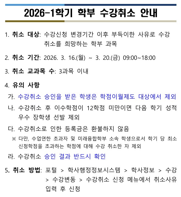 (학부) 2026학년도 1학기 학부 수강취소 안내