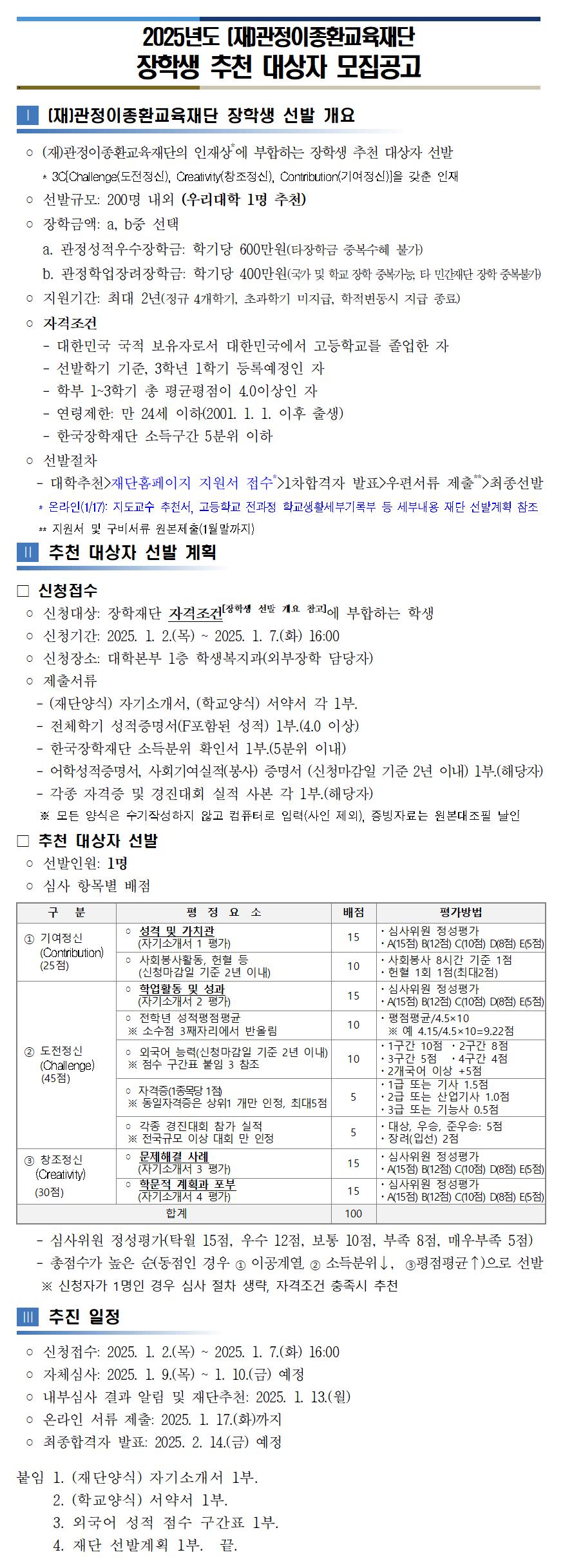 (학부) 2025년도 (재)관정이종환교육재단 장학생 신청 안내