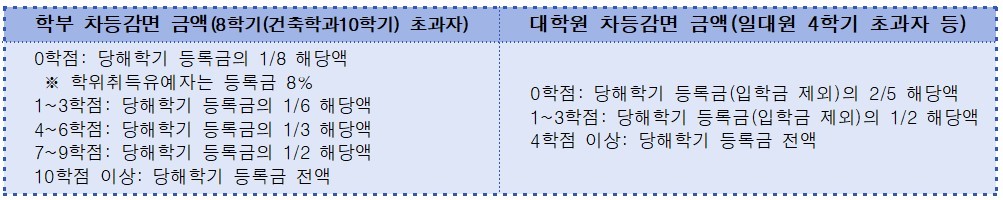 *자세한 사항은 붙임파일 참조 **해양수산경영학과: 인문사회계열에 속함 우리 대학의 2023-2학기 등록금 납부 일정을 아래와 같이 안내드리오니 유념하여 주시기 바랍니다. 1. 수납일정 ![]() ※ 참고사항 1) 학석사연계과정생, 대학원 편입생, 대학원 연구생, 청구논문대체자는 [대학원], 외국인(학부 및 대학원) 신(편)입생(정부초청장학생포함)은 [국제교류부]에서 고지서 수령(납부기간 내) 2) 수납처: 6개 은행(농협, 수협, 부산, 국민, 경남, 하나), 3개 카드사(KB국민, 신한, 삼성) 3) 분할납부: 신청(학생, 부경포털), 변경 및 취소(재무과, 051-629-5142) - 제외대상: 당해 신(편)입생, 재입학생, 수업연한경과자(전액 납부자 제외), 신용카드 납부 예정자 - 분할납부자가 학자금 대출을 원하는 경우 사전 문의(한국장학재단, 학생복지과) 2. 납부방법 ㆍ고지서 조회, 출력 : 부경포털(앱 포함) 또는 부경대 홈페이지 ☞ 납부 후 고지서 출력 불가(고지서가 필요할 경우 반드시 납부 전 출력) ㆍ납부시간 : 등록 대상별 납부 개시일 09:00 ~ 납부 마감일 16:00 ㆍ수 납 처 : 등록 대상별 지정 수납처 (1. 수납일정 참조) ㆍ납부방법 : 창구수납(고지서), 무통장입금 및 계좌이체(가상계좌), 카드납부(카드사) ※ 신용카드 납부 제외 대상: 당해 학기 신(편)입생, 재입학생, 분할 납부자, 학위취득유예자 ㆍ등록금 납부 확인서 출력: 부경포털(학사행정-등록-등록-고지서/납부확인서) ㆍ등록금 납입 증명서 발급 (문의 ☎ 629-5047) ① [교내]무인발급기(본관1층, 중앙도서관, 공학1관, 미래관, 인문경영관) ② [교내]학사관리과 방문(본관1층) ③ [교외]인터넷 증명신청(저장 가능) https://pknu.certpia.com/ 3. 유의사항 ㆍ장학금: 고지서에 반영되지 않은 경우 등록금 선납부 후 지급 ☞ 문의: 학생복지과 ㆍ전액 감면자(0원 납부자): 실제 납입 금액이 없더라도 반드시 등록 필요(① 또는 ② 택일) ① 지정 은행 방문(0원 고지서 지참) ② 학생회비(또는 동창회비) 가상계좌 이체 ㆍ수업연한 경과자(초과자) 및 미래융합대학 학생(수강신청 학점별 등록금 납부) - 수업연한: 학부 8학기(건축학과 10학기), 일반대학원 4학기, 특수?전문대학원(자체기준) - 납부 후 수강학점 변경시 10월말 정산(추가 납부 또는 환불) ☞ 학교에서 개별 연락 ![]() - 수업연한 이내: 수강신청 학점 수에 관계없이 전액 납부 ㆍ등록금 미납 시 조치: 재(복)학생 미등록 제적, 신(편)입생 입학(합격) 취소, 학사학위취득유예자 졸업 ㆍ당해 학기 입학 포기자: 입학일(2023. 9. 1.) 전일까지 전액 환불 ㆍ학생회비?동창회비: 자율 납부(등록 여부와 무관) - 환불 및 영수증 발급은 학생회(051-629-7343), 동창회(051-629-6289)로 연락 4. 문의처(051 - 629 - 내선번호) ㆍ재무과: 등록금 수납(5142) ㆍ학생복지과: 교내장학(5059), 국가장학(5060), 학자금대출(5061) ㆍ학사관리과: 졸업, 자퇴(5037), 휴·복학(5280), 증명서 발급(5047) ㆍ국제교류부: 외국인 학부(6905), 외국인 대학원(6846) ㆍ대학원: 입시/장학/학사(각 대학원) |