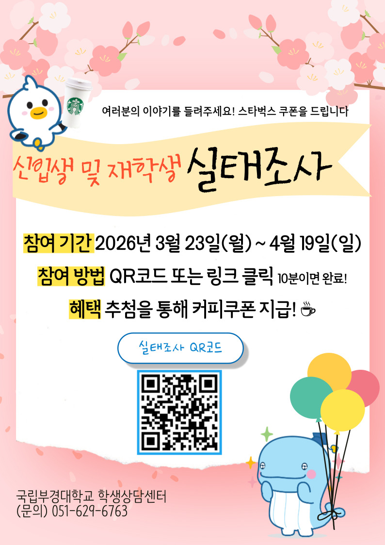 국립부경대학교 학생상담센터에서는 2026년 신입생 및 재학생 실태조사를 실시하고 있습니다. 실태조사 결과는 국립부경대학교 발전을 위한 자료로 활용되오니 많은 참여 부탁드립니다.