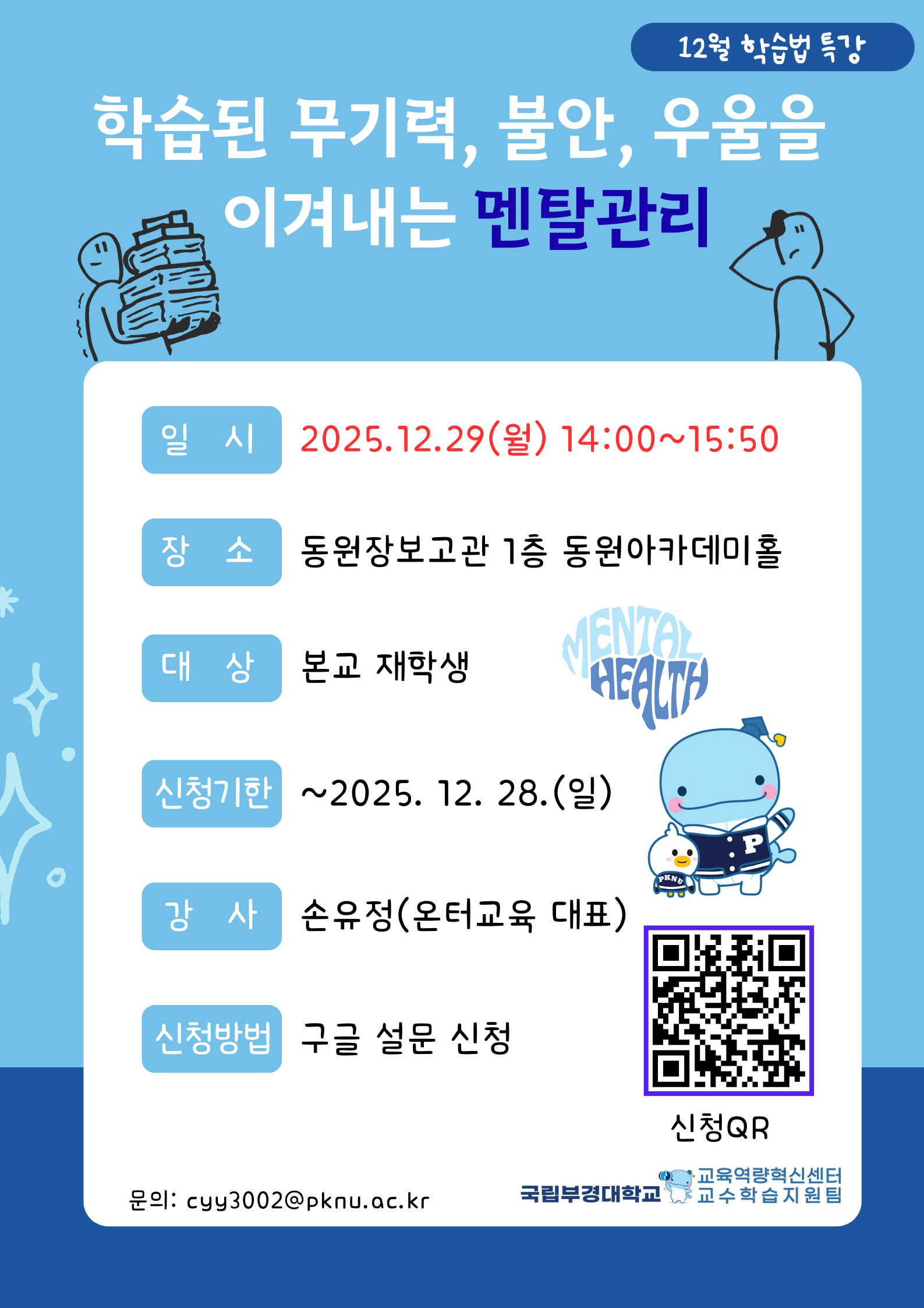가. 일 시: ’25. 12. 29.(월) 14:00 ~ 15:50 나. 장 소: 대연캠퍼스 동원장보고관 1층 동원아카데미홀 다. 참여대상: 본교 학부 재학생 라. 신청방법: 구글 설문 신청(https://forms.gle/EZbB8fRkD1SZZ3dW7) 마. 신청기한: ~ ’25. 12. 28.(일) 바. 특강주제: 학습된 무기력, 불안, 우울을 이겨내는 멘탈관리 사. 강 사: 손유정(온터교육 대표) |
