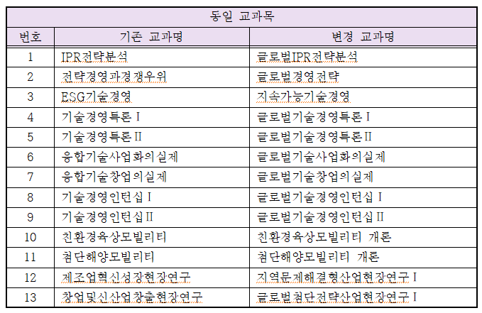 ▣ 전공필수 교과목(전공필수 과목은 졸업 전까지만 이수하시면 됩니다.) ○ 2021학년도 1학기부터 2022학년도 2학기 입학자까지 → 기술회계및재무론, MOT개론, 기술사업화, 연구조사방법 중 2과목 선택, → 제조업혁신성장현장연구, 창업및신산업창출현장연구 중 1과목 선택하여 반드시 이수 ○ 2023학년도 1학기 입학자부터 → 기술회계및재무론, MOT개론, 기술사업화, 연구조사방법, 기술경영통계 중 2과목 선택, → 제조업혁신성장현장연구, 창업및신산업창출현장연구 중 1과목 선택하여 반드시 이수 ※ 23,24년도 입학자 중 현장연구 교과목 미 이수자는 25년도 이후 입학자 현장연구 과목 수강, 동일교과목 지정 목록 확인 ○ 2025학년도 1학기 입학자부터 → 기술회계및재무론, MOT개론, 기술사업화, 연구조사방법, 기술경영통계 중 2과목 선택 → 글로벌첨단전략산업현장연구Ⅰ,지역문제해결형산업현장연구Ⅰ중 1과목 선택하여 반드시 이수