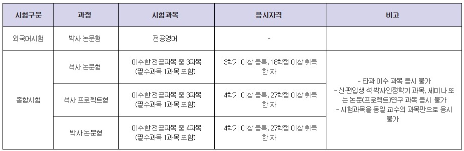 ※ 외국어 및 종합시험을 합격하셔야 학위청구논문 심사신청이 가능합니다. 2026-1학기에 논문심사 계획이 있으신 분들은 외국어 및 종합시험 반드시 신청 하시기 바랍니다.