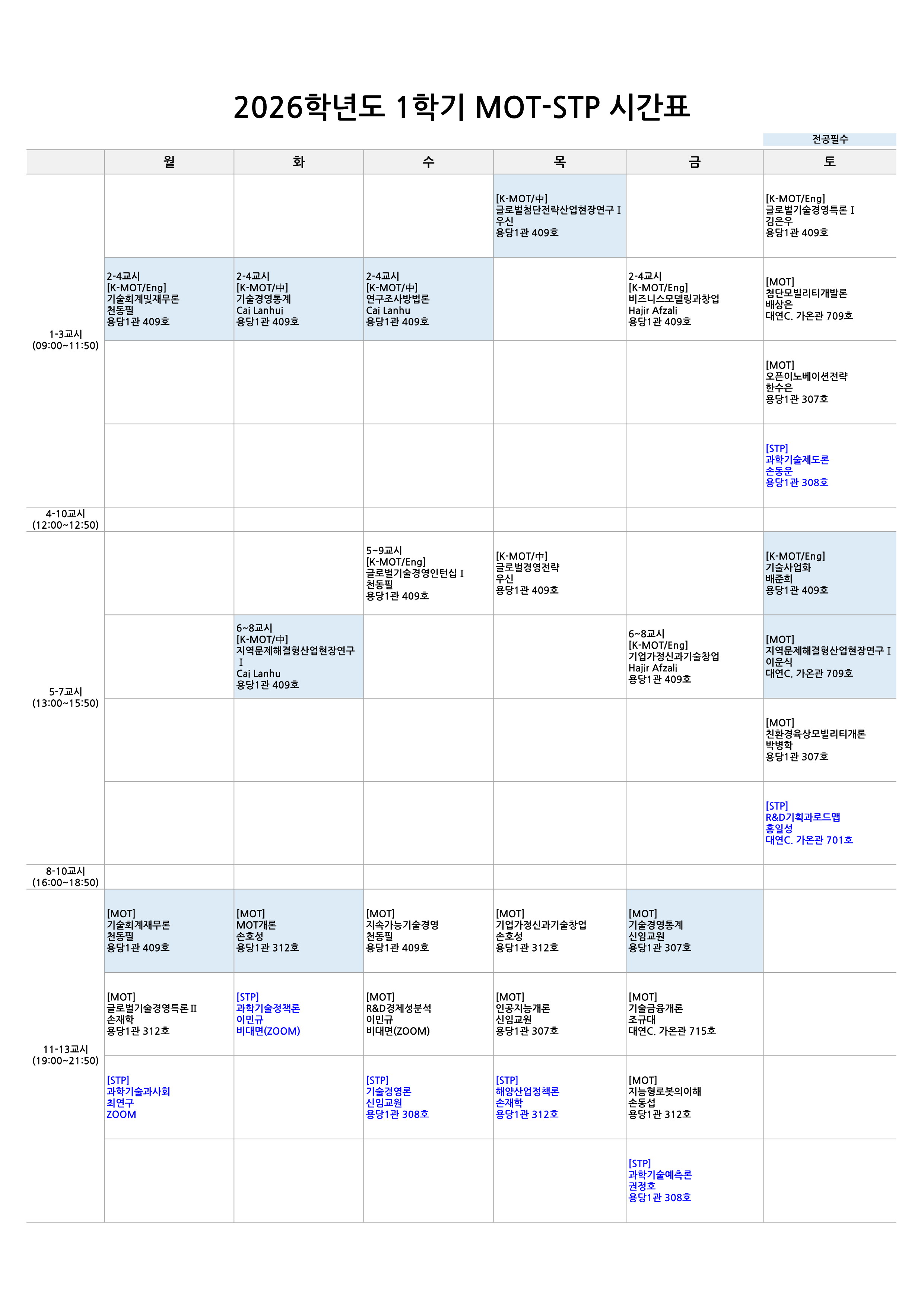 → 기술회계및재무론, MOT개론, 기술사업화, 연구조사방법, 기술경영통계 중 2과목 선택,