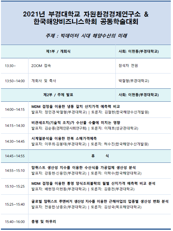 | 2021년 부경대학교 자원환경경제연구소 & 한국해양비즈니스학회 공동학술대회 개최 안내 | |||