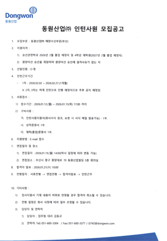[동원산업(주)] 승선연계 해상직 인턴사원 모집 안내