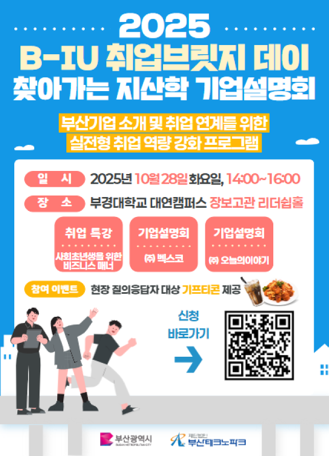 현장실습 취업브릿지데이·찾아가는 기업설명회 개최 안내 ○ 참여대상: 현장실습 참가 희망자 및 재학생 ○ 행사일시: 2025. 10. 28.(화) 14:00 ~ 16:00 ○ 행사장소: 부경대학교 대연캠퍼스 장보고관 3층 리더쉽홀 ○ 행사 일정 및 내용
